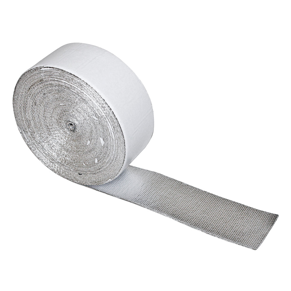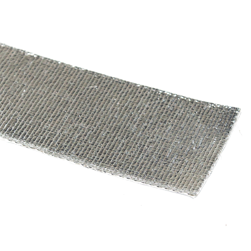 .8mm thick.2" x 50 foot roll (15 metres)- Aluminized material bonded to fiberglass with adhesive back.- Withstands 590°C continuous and 1100°C melt temperature.