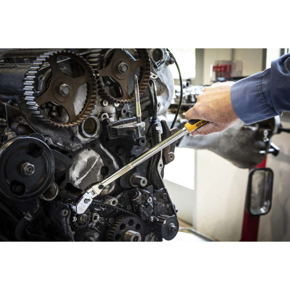 The GEARWRENCH 120XP™ ratchets take access and speed to the next level, making it easier and quicker to complete jobs. The double stacked pawl design gives 120 positions providing a 3 degree ratcheting arc. All of the ratchets feature a low profile head and flush mounted on/off switch, allowing better access in tight spaces. The ratchets are a bright, full polish chrome to resist rust & corrosion and have an enclosed head design which allows for extreme resistance to dirt infiltration. Available in standard and extra-long length handles.