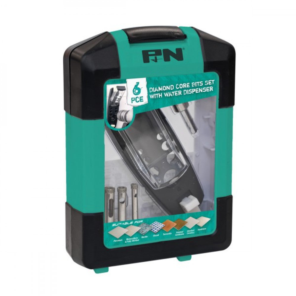 6 Piece Set includes 6, 8, 10, 12 & 15mm Diamond Core Bits with Water Dispenser