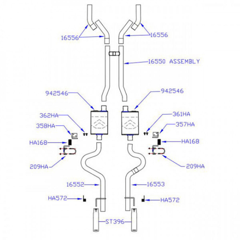 Fits 1967 to 1970 Ford Mustang with a V8 engine, does not fit convertibles or staggered shock models, exits through factory valance cut outs.