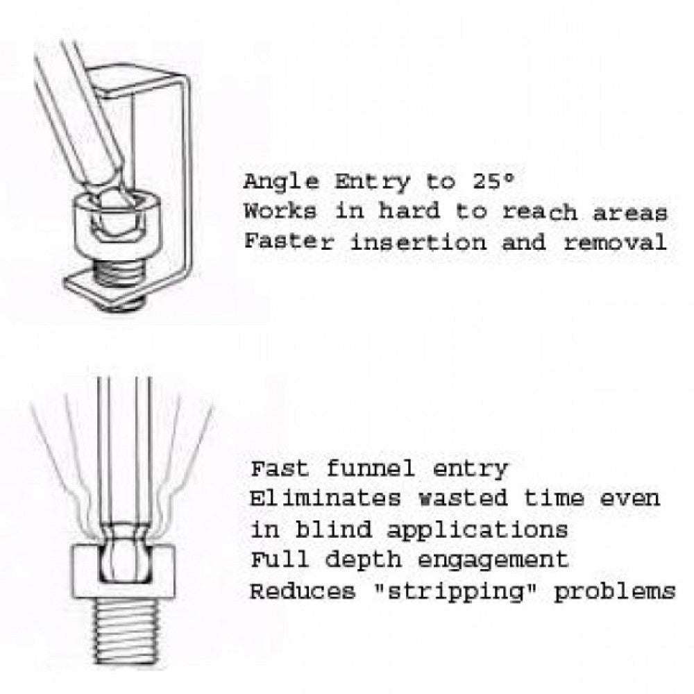 The hex key is the best known hex tool in use. It provides an inexpensive and convenient solution for occasional or low volume fastener insertion or removal. Hex Key Considerations: Hex keys allow insertion and removal by spinning the blade between the fingers. Ballend hex keys are far more efficient than a straight hex blade, since they allow quick insertion from a range of angles. Even when working in wide open spaces, a ballend is a real timesaver. Easily carried in a pocket. Allows working in tight to reach areas. Hex keys require an extension handle to reach the full torque capacity of the long arm of the blade