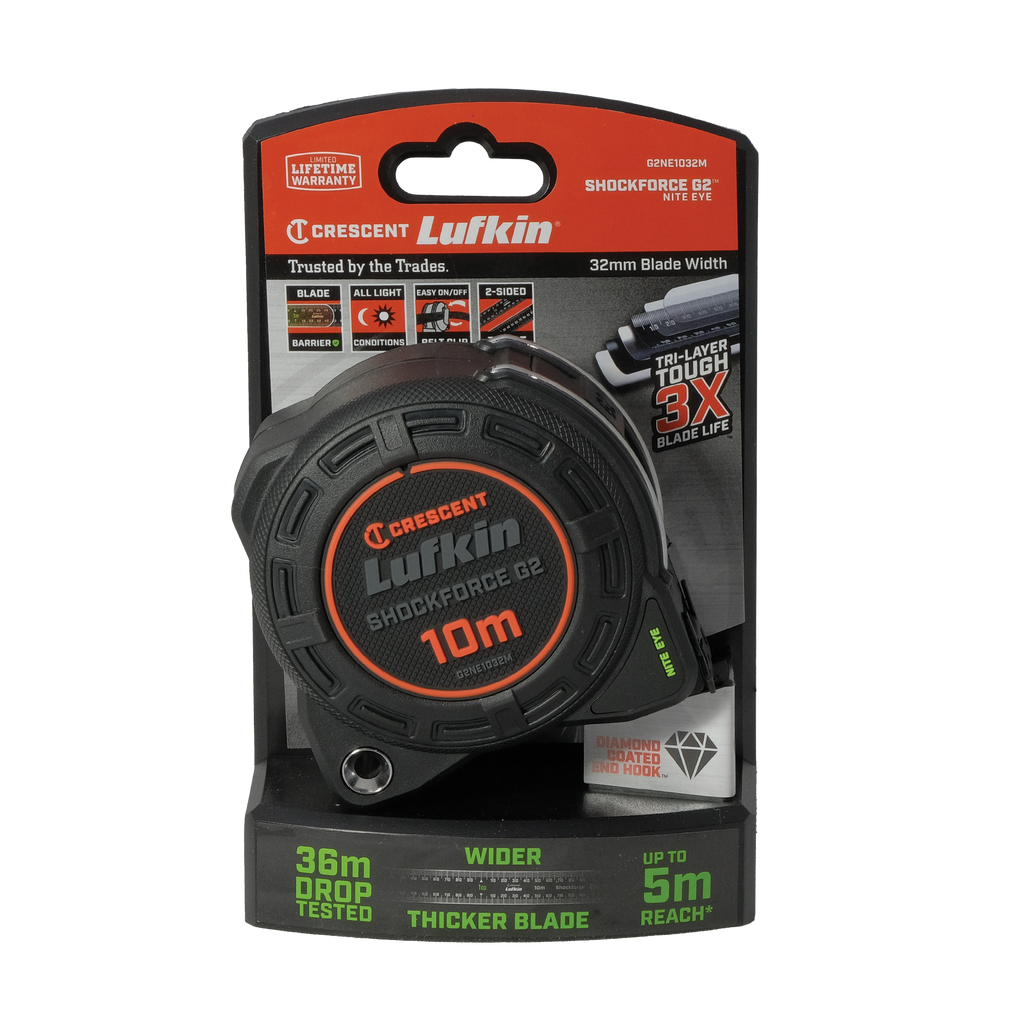 The new Crescent Shockforce G2 Nite Eye tapes have wider, thicker blades for 5 metres reach and a new blade barrier coating for 3X the blade life. They have a bolstered case and fastening points, plus dual steel guardrails on both sides of the lock button – all for superior impact protection. They’ve been 36 metres drop tested for extreme durability. That means they’re not just the best performing tapes we’ve ever made…they’re also the toughest.