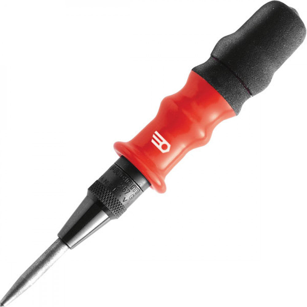 Simply press the end to release spring impact. Impact adjustable from 15 to 25 kg. Ergonomic Facom handle. Tip hardened to 57 - 60 HRc. Weight: 0.175 kg.