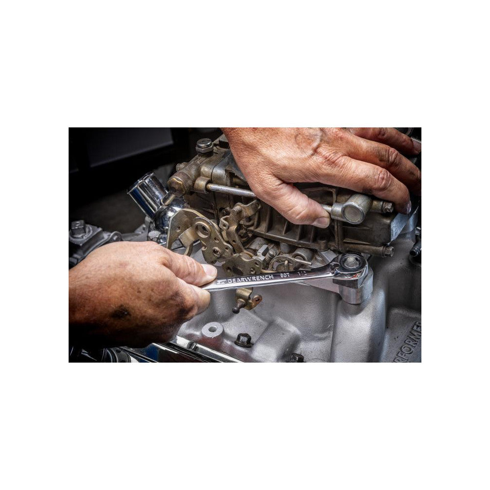 GEARWRENCH 90-tooth reversible ratcheting wrench swing arc of just 4° turns fasteners in extremely tight spaces. Longer, wider beam delivers improved reach, leverage, and comfort. Large color-coded SAE/metric markings make size identification easy. All exceed ASME performance specs and come with the trusted GEARWRENCH Full Lifetime Warranty.