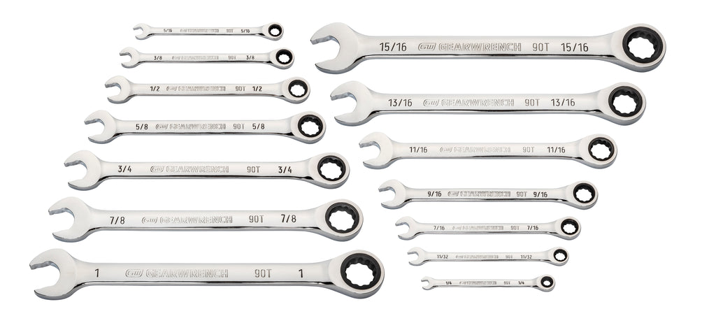 GEARWRENCH 90-tooth ratcheting wrench swing arc of just 4° turns fasteners in extremely tight spaces. Longer, wider beam delivers improved reach, leverage, and comfort. Large color-coded SAE/metric markings make size identification easy. All exceed ASME performance specs and come with the trusted GEARWRENCH Full lifetime warranty.