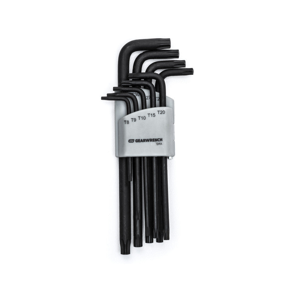 The GEARWRENCH 9 piece Torx® key set includes keys made from alloy steel to deliver maximum strength and resist rotational distortion. Chamfered edges help slide the keys easily into fasteners, and a clearly labeled caddy offers convenient storage.