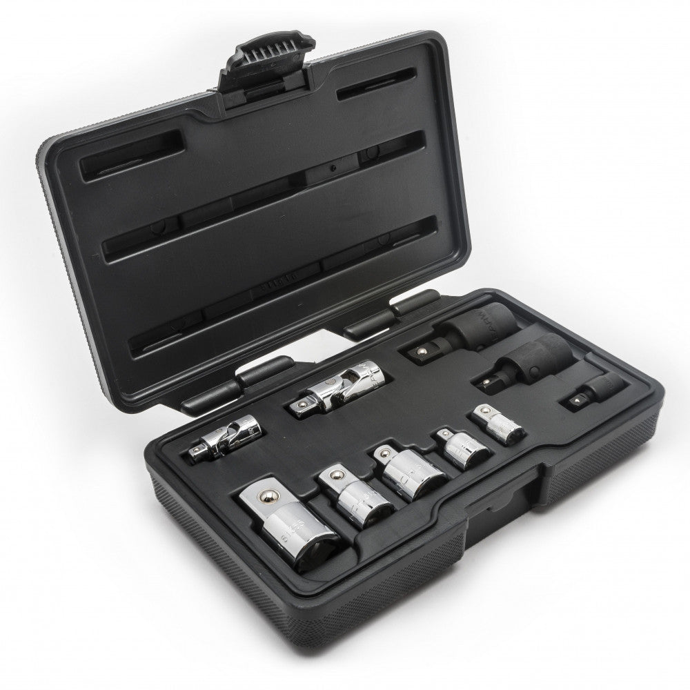 10 pc. 1/4", 3/8" & 1/2" Drive universal joint and adapter Set Includes universal joints, Impact universal joints, and adapters.
