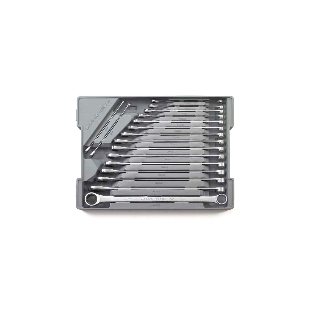 GearWrench 85989 17-piece XL gear box double box end Metric Ratcheting Wrench Set consists of 1 of each 8, 9, 10, 11, 12, 13, 14, 15, 16, 17, 18, 19, 20, 21, 22, 24 & 25mm XL gear box Ratcheting Wrenches. Ratcheting box end need as little as 5° to move the fastener as opposed to 30° for standard box end Wrenches. The standard box end combined with the Long Pattern Length gives this Wrench excellent torque capabilities to break a stubborn, rusted fastener. The Ratcheting box end then makes the loosening or tightening of the fastener fast & safe. The box end Features improved box end strength from GearWrench's Off-corner loading & at the same time, reduces fastener rounding. The double box end Ratcheting Wrenches are Made from the finest Chrome vanadium Steel for precision long lasting tool life. Comes with a blow molded carrying case that can be hung on a wall or keep your Wrenches organized in your tool box or rollaway.