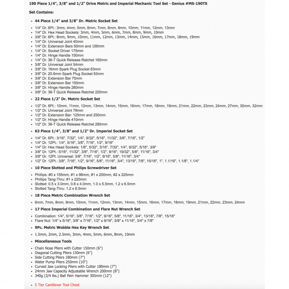 Genius 190 Piece Metric/Imperial Tool Kit in 5 - Tier Cantilever Tool Box
