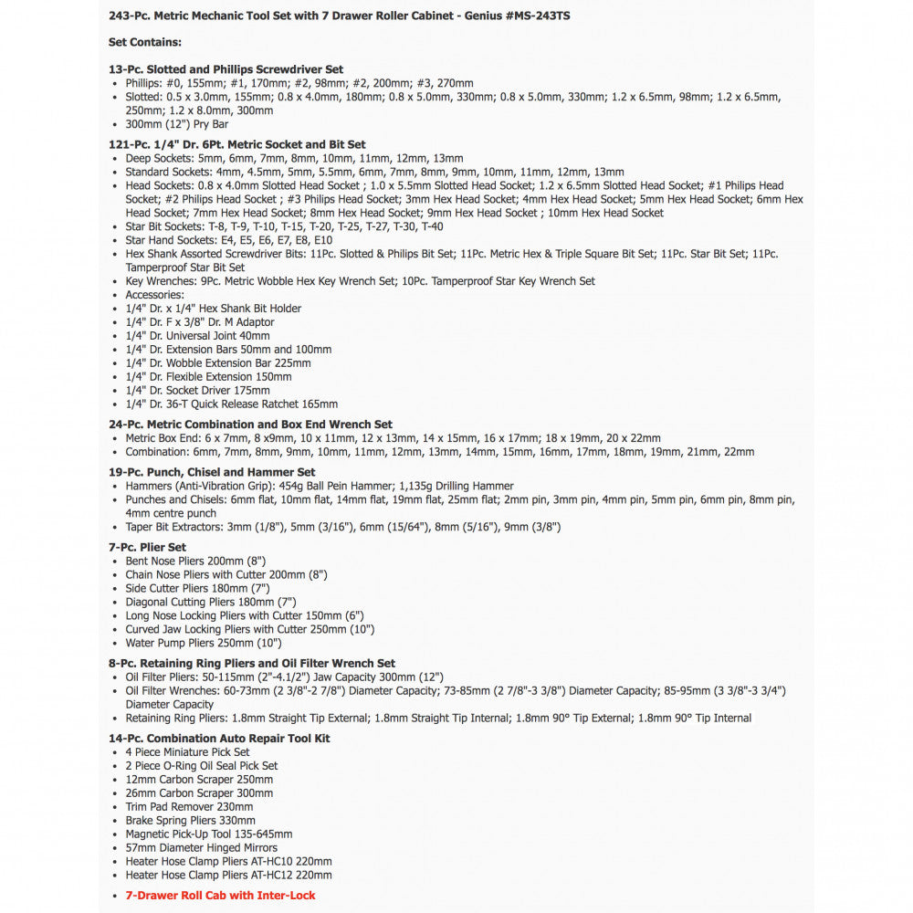 243 Piece Metric Mechanic Tool Set with 7 Drawer Roller Cabinet - Genius #MS-243TS