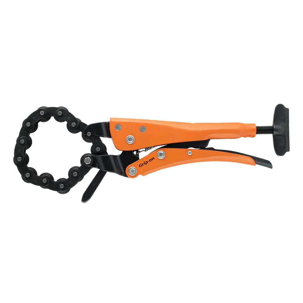 The Grip-On Series 182 Chain Pipe Cutter is a versatile tool that can cut through a variety of thin wall pipes such as steel, copper, and PVC, up to 2.6mm in inaccessible areas, making it a useful tool for hard-to-reach spaces. Its simple ratcheting mechanism eliminates the need for hand gripping effort and ensures perfect tracking, while the 13 alloy steel cutting wheels make evenly cutting difficult-to-reach thin wall pipes a breeze. The cutter's locking mechanism prevents lateral movement and misaligned cutting, while the butterfly screw allows for easy feeding as cutting. The adjustable jaw opening, ergonomic design, and comfortable handling make the cutter easy to use. Its superior quality forged steel jaws, concave profile for better push-pull, and epoxy paint coating on the handle make it 20 times more corrosion resistant than nickel, ensuring that it is durable and reliable.
