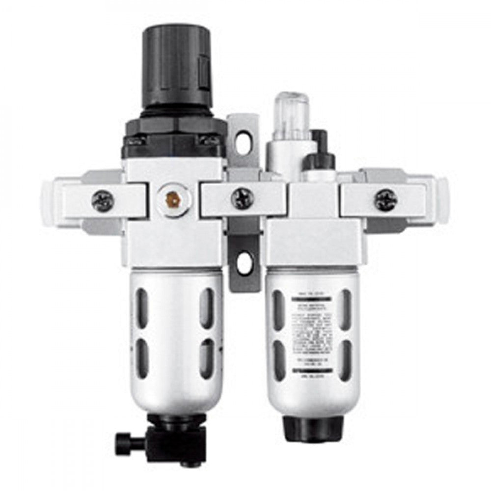GZ60406 - GROZ Air Filter-Regulator-Lubricator Combination Unit Space saving 2 pc Modular Filter-Regulator Combination & Lubricator is by far the most popular Air Preparation unit. They are attached in series using spacers & piping adapters which makes the 2 components easily removable / mountable without disturbing the pipe line. Come complete with a wall mounting bracket. Air Filter is used to separate dust dirt moisture & other contaminants from compressed air. Filter has a Die Cast Aluminium body polycarbonate bowl with a steel bowl guard & a high performance Sintered Bronze Filtering element. Filter is designed with a Separator & shield for efficient moisture separation. Regulators have a Non Raising “Press to Lock” adjusting knob for locking at any set pressure. Regulators work on a Diaphragm operated relieving type mechanism with pressure compensated by balanced poppet. These maintain a constant oil-to-air density over a wide range of flow. Lubricators are Fog/Micro Mist type upto 15m / 50ft pipe runs. Designed for best performance with 32 grade oil. These have a Die Cast Aluminium Head polycarbonate bowl with a steel bowl guard. The head is fitted with Oil drop indicator Oil drop controller & Oil filling plug - Pressure adjustment range of 7 - 145 PSI (0.5 - 10 BAR) - 40 micron filtering element - Press Type Manual Drain with Night Time Drain feature which automatically drains off the bowl once the compressed air supply to the filter is switched off. WETTED COMPONENTS: Aluminium Bronze Brass Steel Acetal Polycarbonate Stainless Steel & Nitrile FRCLM-14 INTERMEDIATE COMPLETE WITH 42MM GAUGE Max flow rate: 63 CFM / 1800 LPM Min flow rate: 1.41 CFM / 40 LPM Bayonet type steel bowl guard Regulator with in-built Venturi for Flow Compensation CONFORMS TO ISO 6953-1 5782-1 & 6301-1 WARNING: Polycarbonate bowls may get damaged and possibly fail if exposed to synthetic oils thinner solvents trichloroethylene kerosene or other aromatic hydrocarbons.