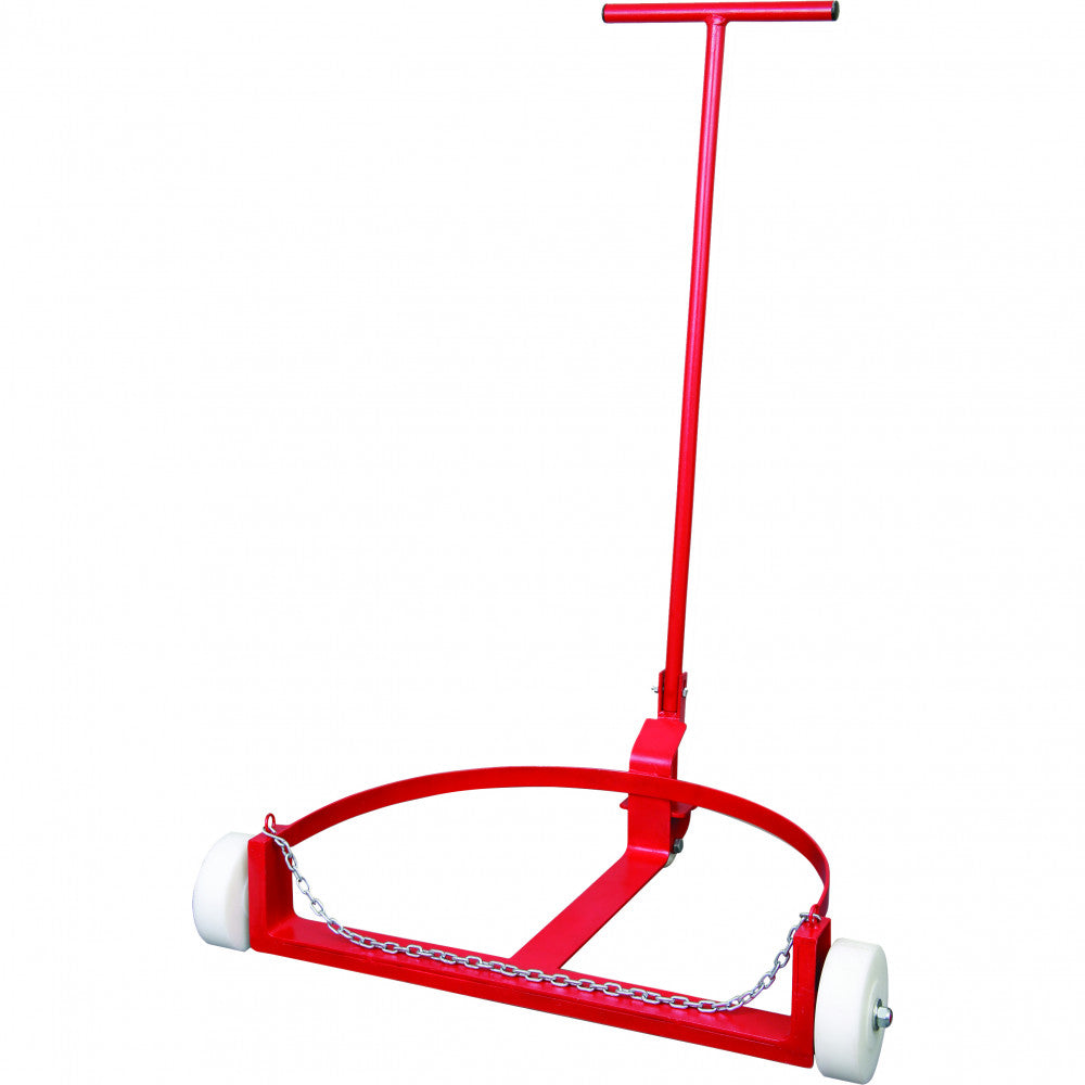 GZ44396 | Groz Low Profile Drum Truck For 205L Drums • Low Profile Drum Trolley with Drum Platform only 12mm off the floor facilitating easy loading & unloading. • Designed to conveniently move 205 litre drums of all types. • Trolley can accommodate drums up to a dia. of 26 (660mm). • Extra Heavy Duty construction fabricated from 5mm (6 gauge) steel sheet with a loading capacity of 545kg. • Removable pivoting handle includes drum tipper for easy loading. • Includes 2 large Phenolic front wheels 46 x 47mm wide & one back phenolic swivel wheel 75mm dia. x 35mm wide. • Fully powder coated finish.