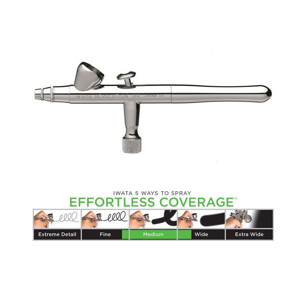 Iwata Revolution Series airbrushes deliver soft, effortless coverage and quality atomization at low air pressures making them a great choice for general purpose spraying.