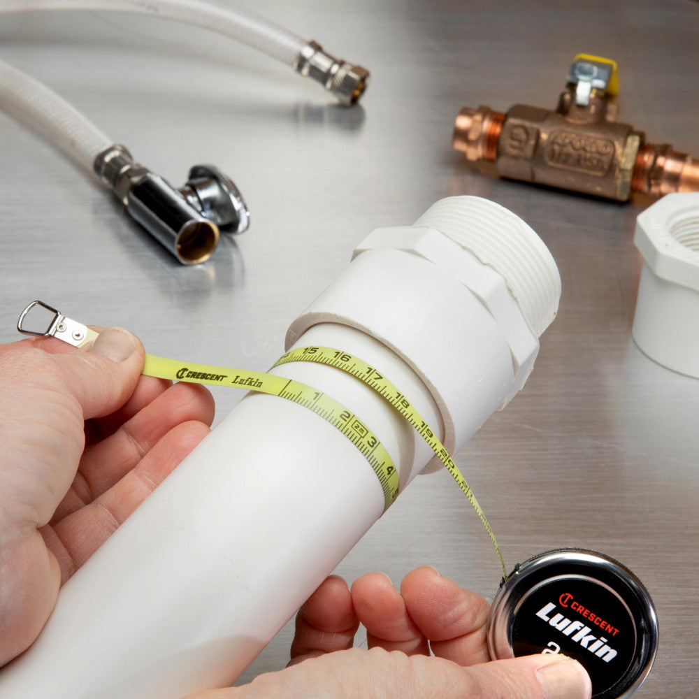 This LUFKIN Executive® measuring tape allows you to convert measurements from diameter to circumference by just turning the blade over. Model has bold, easy-to-read graduations on a yellow background, with zero falling in the same place on both sides of the blade. Spring-action design allows you to easily and quickly retract the blade. Measuring tape is ideal for measuring the diameters of cable, pipe, and tires.