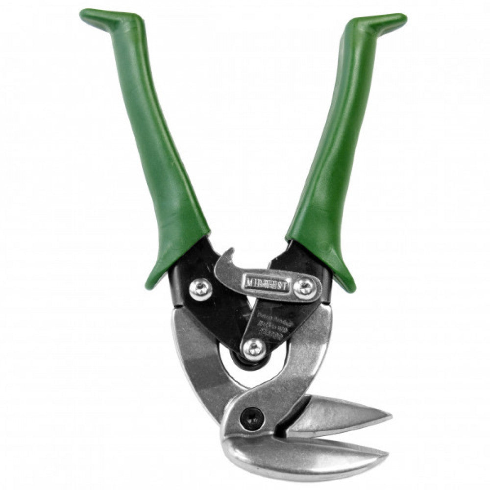 Upright Right Aviation Snips Upright aviation snips make cutting in confined or overhead spaces easy. Made in USA the GLIDE-TECH forged blades produce the cleanest fastest cuts requiring fewer re-bites and the precision needed for tight turns. Features: Colour coded Green handles identify the tool as a Left hand model Can be used with blades up or down in a pushing or pulling motion An ergonomic design improves the users range of wrist motion Blade pivot bolt is threaded into bottom blade keeping blades in adjustment for ease of operation Top and bottom blades are serrated to hold material during cutting creating a clean edge Hot drop forged blades stay sharp Cuts right curves and straight Nominal Length: 205mmCuts 24ga cold rolled steel