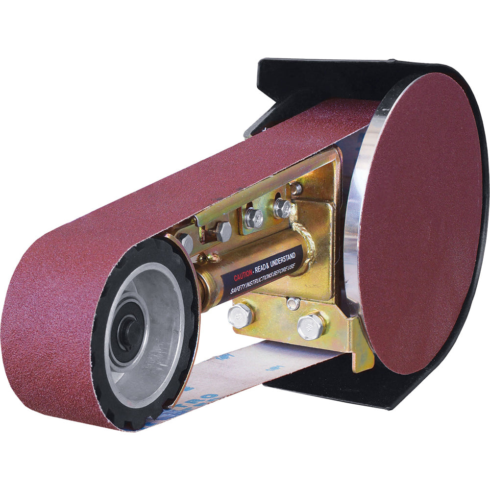 PO362 | Multitool Belt & Disc Grinding Attachment Attachment for TM400-200 Bench Grinder 8in (200mm) Features The Multitool is a renowned Australian designed belt grinding attachment which can be used on most bench grinders. The technology replaces the grinding wheel and converts a traditional grinder into a sophisticated work station ideal for sanding grinding sharpening shaping polishing and refinishing. • EFFICIENCY - Superior performance and a user friendly belt change of under 5 seconds. • VERSATILITY - Grinding sanding or polishing in 4 positions on rubber contact wheel platen disc or free strapping. The unit can also be swivelled vertically or any position in between. • ACCURATE TRACKING - The running position of the belt is simple to adjust and it stays there allowing for finishing into sharp corners. • QUALITY CONSTRUCTION - Robust maintenance free with sealed ball bearings hardened and ground essential components and zinc plating. • 3 YEAR WARRANTY - Against faulty materials and workmanship even when used commercially. Specifications • 36in x 2in (915 x 50mm) Belt (100 Grit) • 7in (178mm) Diameter Disc (120 Grit) • 3-1/2in (89mm) Diameter Rubber Contact Wheel • 5-1/2in (140mm) Diameter Drive Wheel • Suits most popular 6in or 8in Bench Grinders with a screw mounted wheel guard and a minimum of 1/3 HP • Suits grinder shaft sizes of 5/8in and 1/2in. A steel bush is supplied to adapt the drive wheel to 1/2in • Fitting Kit supplied.