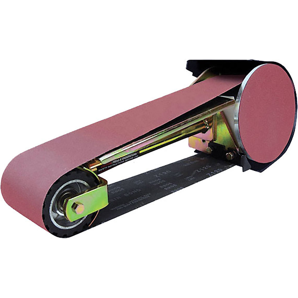 PO484 | Multitool Belt & Disc Grinding Attachment 1220x100mm Features The Multitool is a renowned Australian designed belt grinding attachment which can be used on most bench grinders. The technology replaces the grinding wheel and converts a traditional grinder into a sophisticated work station ideal for sanding grinding sharpening shaping polishing and refinishing. • EFFICIENCY - Superior performance and a user friendly toolless belt change in under 5 seconds. • VERSATILITY - Grinding sanding or polishing in 4 positions on rubber contact wheel platen disc or free strapping. The unit can also be swivelled vertically or any position in between. • ACCURATE TRACKING - The running position of the belt is simple to adjust and it stays there allowing for finishing into sharp corners. • QUALITY CONSTRUCTION - Robust maintenance free with sealed ball bearings hardened and ground essential components and zinc plating. • 3 YEAR WARRANTY - Against faulty materials and workmanship even when used commercially. Specifications • 48 x 4 wide (1220 x 100mm) belt. • 7 (178mm) diameter disc. • 3 1/2 (89mm) diameter rubber contact wheel. • 5 1/2 (140mm) diameter drive wheel. • Suits most popular 8 bench grinders with a screw mounted wheel guard and a minimum of 3/4 HP. • Suits shaft sizes of 5/8 and 1/2 . A steel bush is supplied to adapt the drive wheel to 1/2 . • Fitting Kit supplied. NOTE: This is an attachment only.
