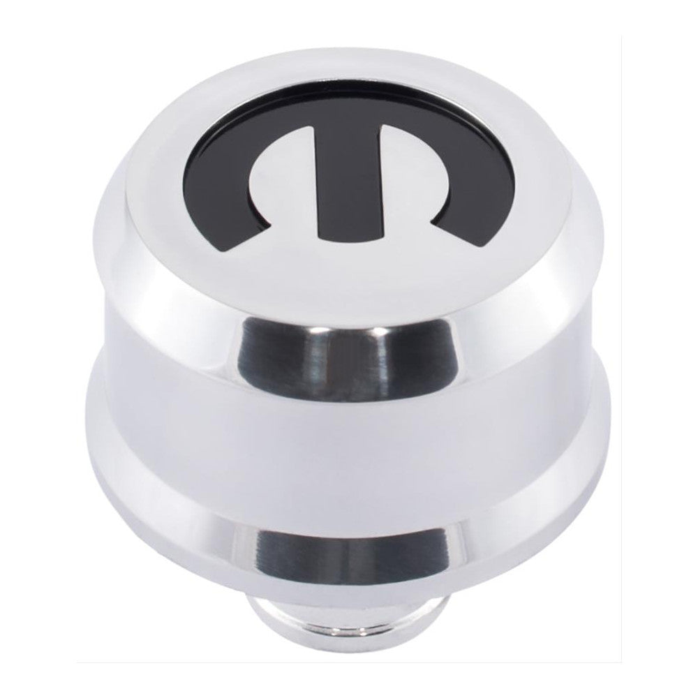 Mopar Enthusiasts Rejoice! No more stamped steel breather caps for aluminum valve covers! Complete your engine dress-up look with a breather cap that improves your engine compartments look. These new Slant-Edge aluminum push-in breather caps are available in three different finishes, with raised and milled, or recessed with inlaid painted emblems. The vivid 3D Mopar omega emblem gives this 2.5 inch diameter breather cap a bold clean look that