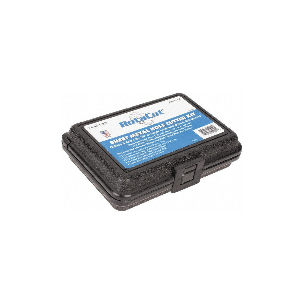 Plastic tool case contains 11088 Arbor Assembly, Center Punch, extra Pilot, and (7) Cutters (5/16", 3/8", 7/16", 1/2", 9/16", 5/8" & 3/4")