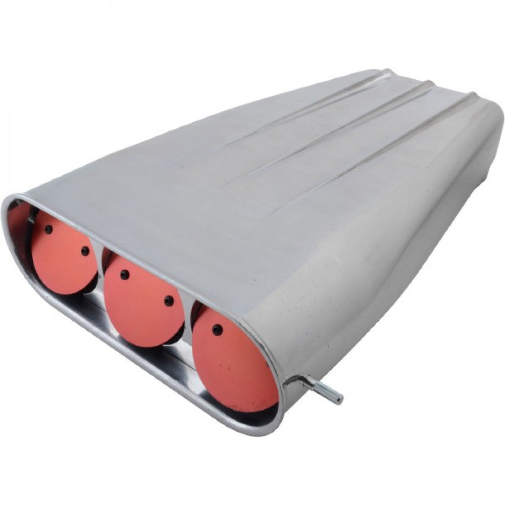 Aluminum Street Hood Scoops are designed with three round inlet butterfiles with reversible flaps and give your street machine a classic look. RPC Street Hood Scoops are machined from aluminum castings that are beautifully polished for a great look! Street Hood Scoops are available in dual quad styling, with or without fins, and they come in your choice of either a paper or washable filter element. These Dual Quad Hood Scoops have an adjustable centerline that measures 7.75 to 9.25 inches with either red flaps. Each street hood scoop includes a 6.375 inch x 2.5 inch element, mounting hardware and adapter plates for either dual or single application.