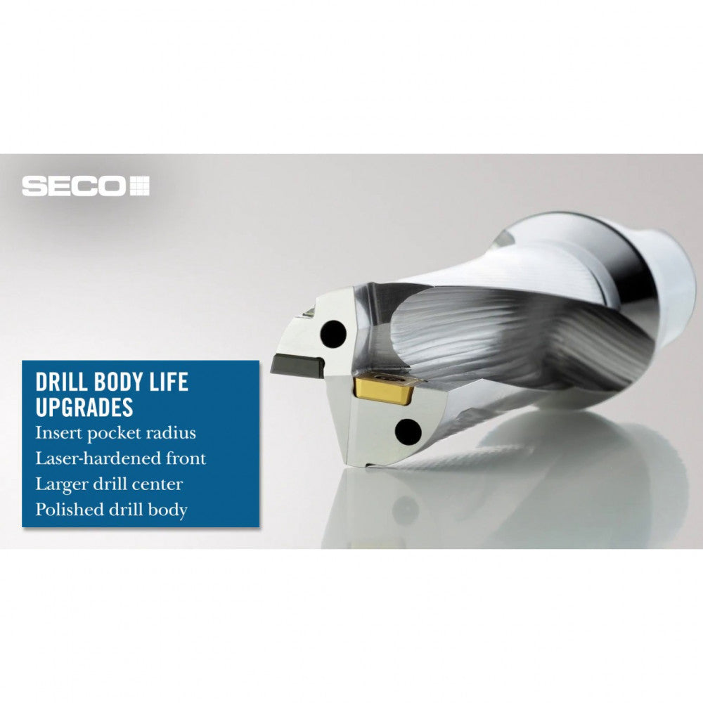 18mm Dia 3xD Drilling Depth Drill. 25mm ShankPerfomax® is Seco®s range of indexable insert drills. The strong, square inserts offer four cutting edges per insert and the possibility to use our most modern insert grades. The high drill body stability, low friction coated drill body, optimised chip flute design and strong inserts offer excellent productivity. The tool is capable of very high feeds and speeds. On top of that, the tool life of both inserts and drills is outstanding. Perfomax is a door opener and will perform very well against any competitor. High productivity, cost effectiveness - Very high feed rates and speeds - Strong drill body - Long tool life of both inserts and drills - Square inserts with four cutting edges - Good surface finish - even at high feed rates Process security - Unique chip flute design - excellent chip evacuation - Drill and insert strength - Low friction coating High flexibility - Large range of drill diameters and lengths User friendly - Low noise thanks to optimised chip flute design - Informative laser marking on shank