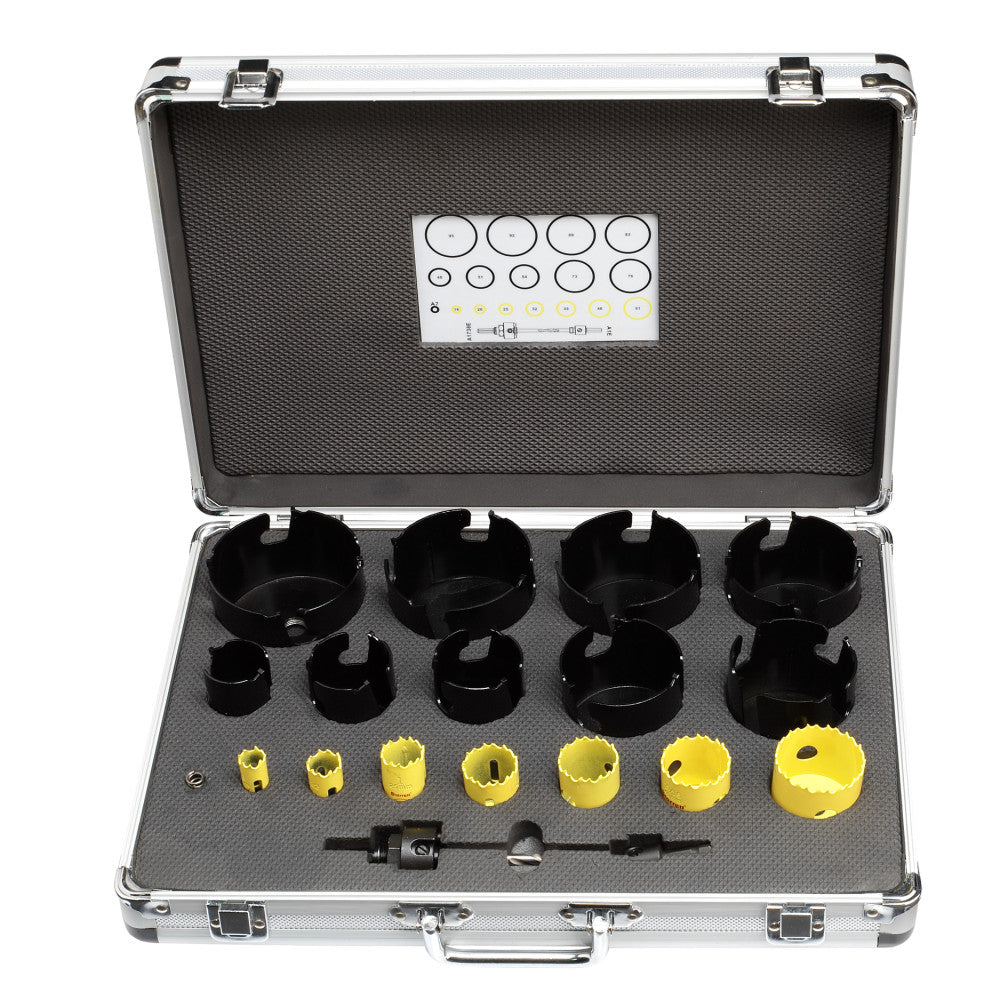 Starrett "Mother Of All" hole saw kit is designed to help you tackle a wide range of materials. It combines the fast cut hole saws (FCH) and carbide tipped hole saws (MPH) in one kit. The saws included in this kit are ideal for wood, plastic, plaster, stainless steel, metals and mild steel sheet.