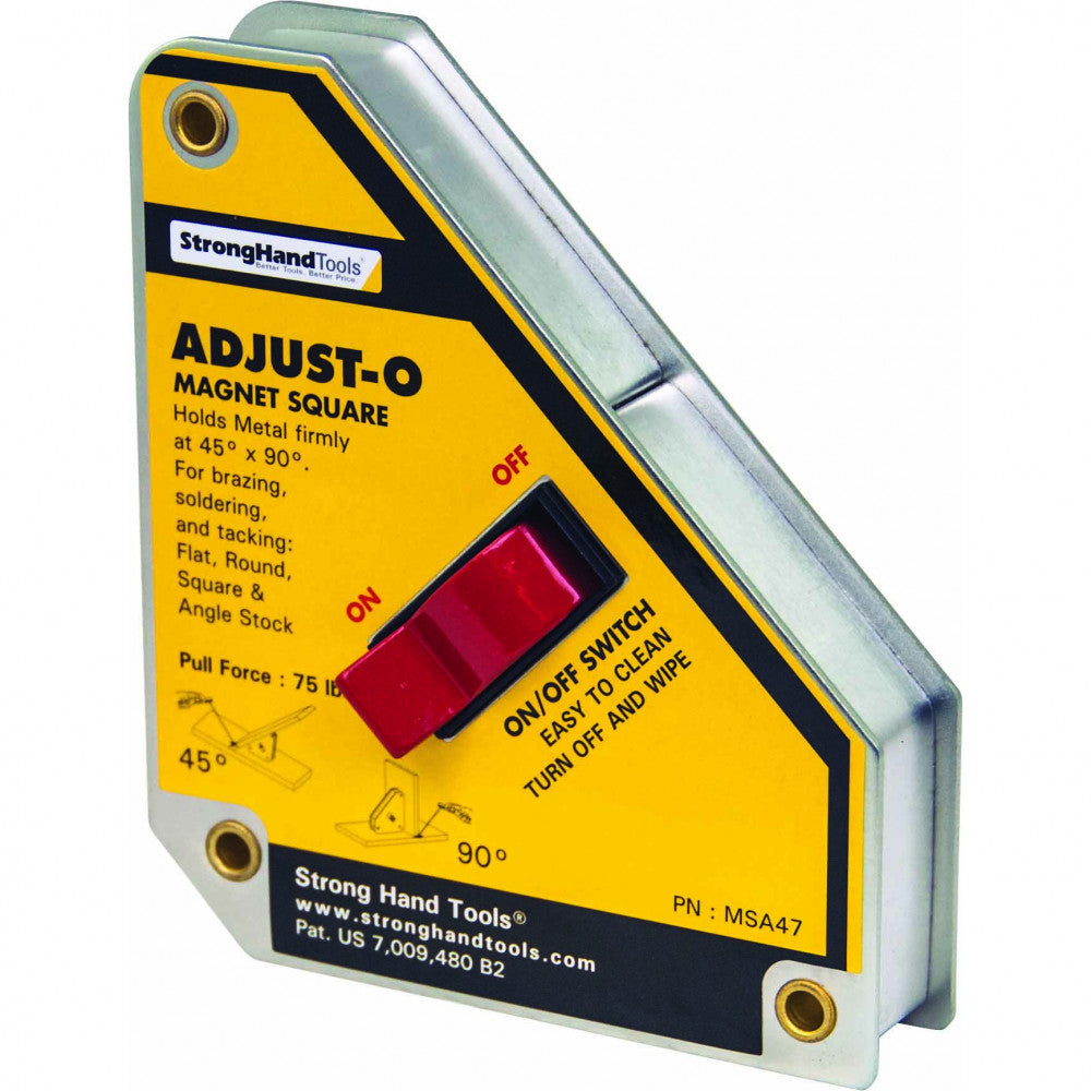 SHMSA47 | Stronghand Adjust-O Magnet Square 45/ 90deg. 35 KG Adjust-O™ Magnet Squares The original magnet squares featuring On/Off switches. The fast & easy way to hold metal workpieces at 45° and 90°. • Turn the magnet Off or at the mid-point position when setting up turn On when you’re ready to work. Fast and safe set-up! • Ideal for round and square tubing angle and flat stock. • Easy to clean. Simply turn Off and wipe. • Max. Pull Force: 35kg • Dimension: 150 x 130 x 32mm • Weight: 1.0 kg