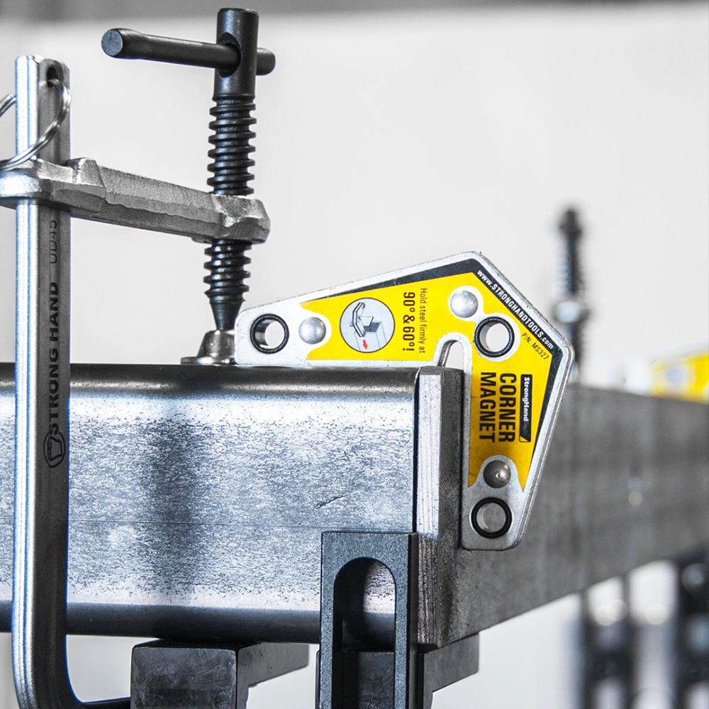 SHMST327 | Stronghand Corner Magnet Twin Pack Corner Magnets Time saving magnetic tools for use in the shop & in the field • Description: Twin Pack • Max. Pull Force: 14 kg • Dimension: 83 x 95 x 16 mm • Create 90° corners by holding from the outside providing you with an unobstructed area for inside tack welds. • One side corner “relief” provides clearance for tall lips. • Use the outer edges of the Corner Magnet for setting up materials at 60°. * Must be used for tack welding only and removed before completing weld. Avoid prolonged exposure of magnetic products to heat sources of 176ºF / 80ºC. *Magnetic force is based on the longest side of Magnet with 3/8? thick steel.