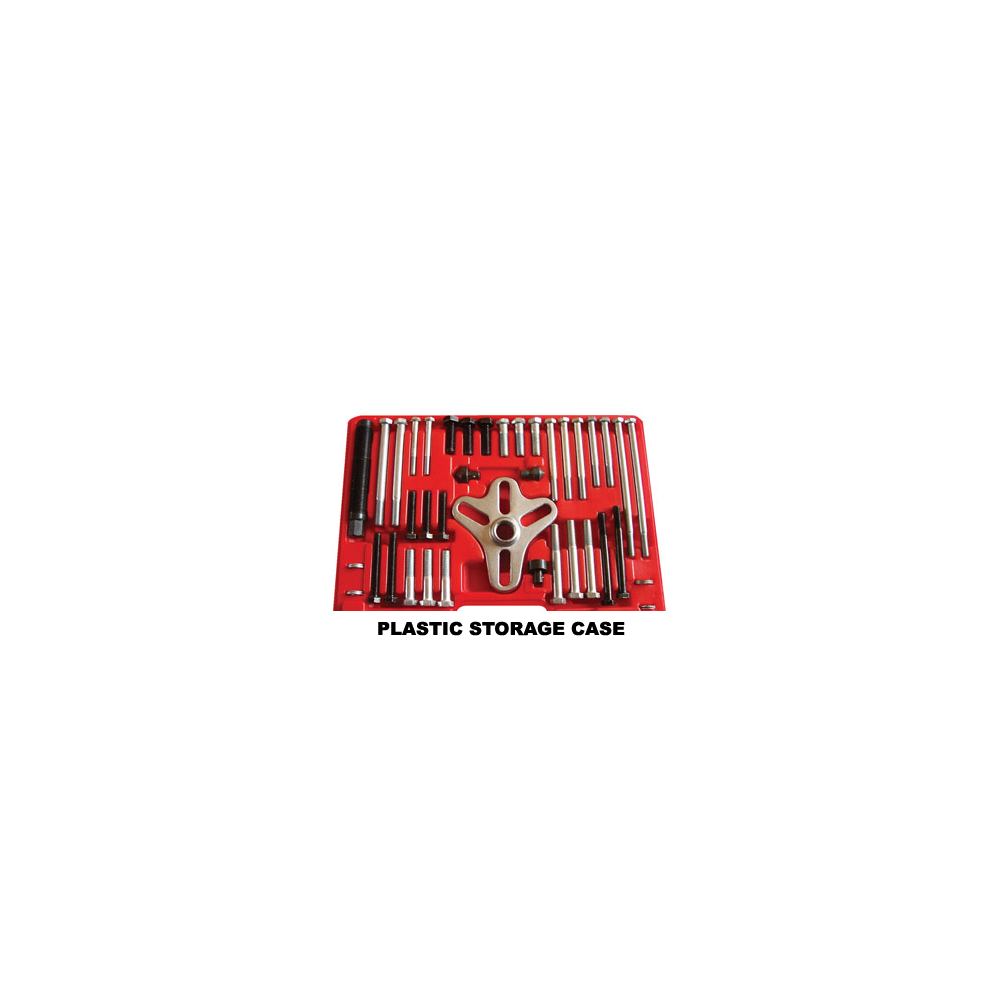 This bolt puller automotive service kit includes everything you need to remove harmonic balancers, gear pulleys, steering wheels and crank shaft pulleys.