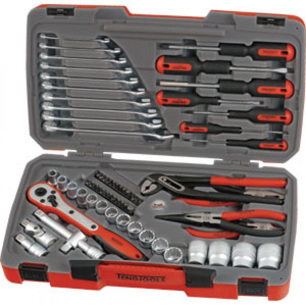 T1268 - 1/2in Drive Metric Socket & Tool Set 68 piece 1/2in drive tool set containing 16 regular 12 point metric sockets FRP ratchet universal joint 2-1/2in and 6in extension bars adaptor 3/8F:1/2M bits holder with magnetic bits holder 10 combination spanners 6 screwdrivers 4 pliers as well as 26 bits. Supplied in a plastic carrying case with latch lid retractable handle and metal pin hinges. The underside of the case is fitted with rubber feet to prevent it from sliding. Set Contents: • Accessories: 1/2in Dr. FRP ratchet 2-1/2in and 6in extension bars universal joint 1/2F:3/8M T-bar adaptor bits driver handle with magnetic bits holder. • Regular sockets (1/2in drive 12 point): 10 11 12 13 14 15 16 17 18 19 21 22 27 30 32mm • Combination spanners: 8 10 11 12 13 14 15 16 17 19mm • Screwdrivers: 3.0mm flat 5.5mm flat 6.5mm flat PH0 PH1 PH2 • Pliers - 6in side cutter 7in combination 8in long nose 10in water pump • Bits (25mm 1/4in hex): TX8 TX10 TX15 TX20 TX25 TX27 TX30 TX40 TX45 TX50 3mm hex 4mm hex 5mm hex 6mm hex 8mm hex 10mm hex PH0 PH1 PH2 PH3 PZ1 PZ2 PZ3 4mm flat 5.5mm flat 7mm flat Case Size: 466 x 258 x 103mm Net Weight: 6.72kg