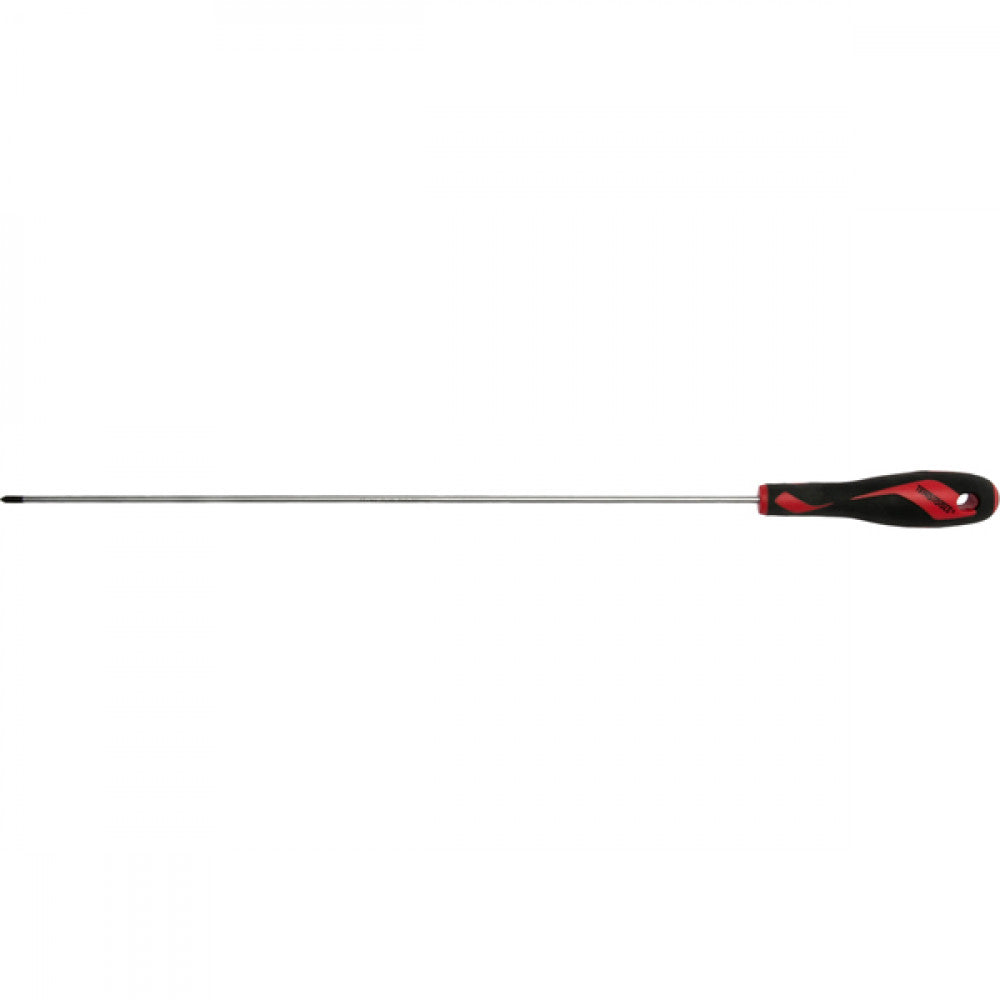 TengTools Screwdriver - Phillips Head Shaft of TT-MV PLUS steel. Phosphated black tip. Ergonomically designed two component handle with hanging hole. DIN 5260 • Phillips Head: No. 0 • Blade Design: Round • Blade Length: 300mm • Handle Length: 96mm